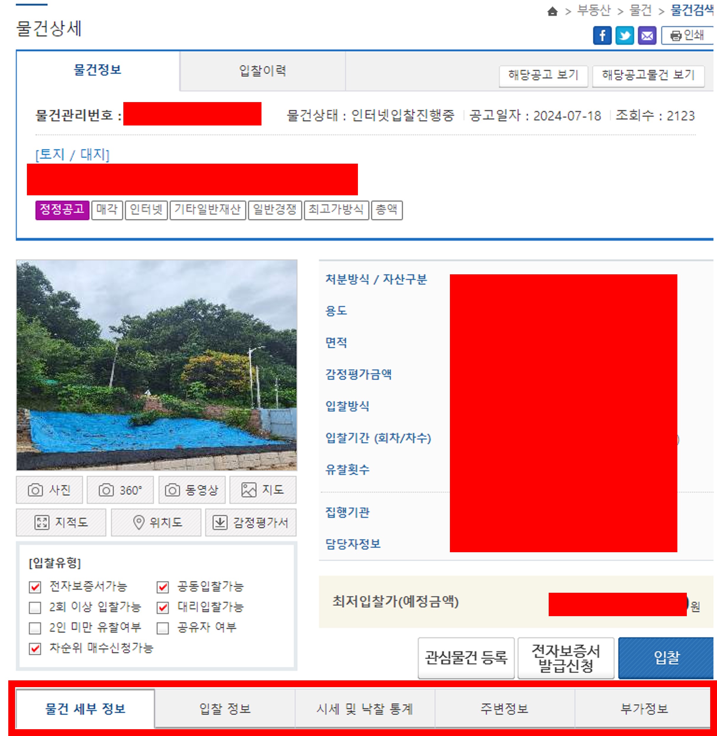 검색을 통해 관심 있는 공매 물건을 찾았다면, 해당 물건의 상세 페이지로 이동하여 다음의 정보를 확인합니다: